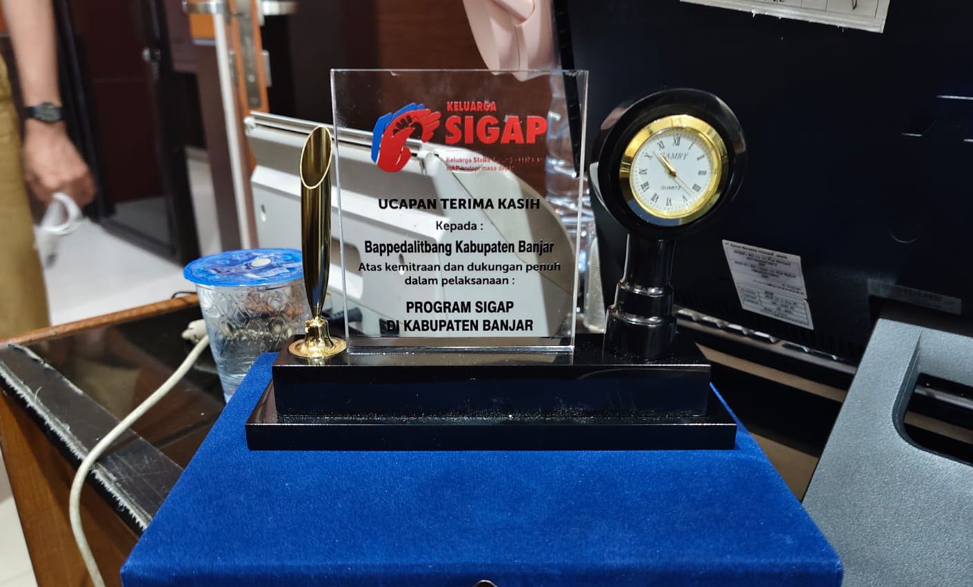 BANJARBARU – Badan Perencanaan Pembangunan Daerah, Penelitian dan Pengembangan (Bappedalitbang) Kabupaten Banjar menerima apresiasi berupa plakat atas dukungan dan keterlibatan aktif dalam keberhasilan Program Keluarga SIGAP di Kabupaten Banjar. Plakat penghargaan tersebut diserahkan langsung oleh Team Leader Program Keluarga SIGAP, Ardi Prastowo, dan diterima oleh Kepala Bappedalitbang Kabupaten Banjar yang diwakili oleh Kepala Bidang Pemerintahan dan Pembangunan Manusia (PPM), Fara Hayani. Momen serah terima ini berlangsung dalam rangkaian kegiatan Desiminasi dan Serah Terima Program Keluarga SIGAP di Kabupaten Banjar, bertempat di Grand Qin Banjarbaru, Selasa (10/2).