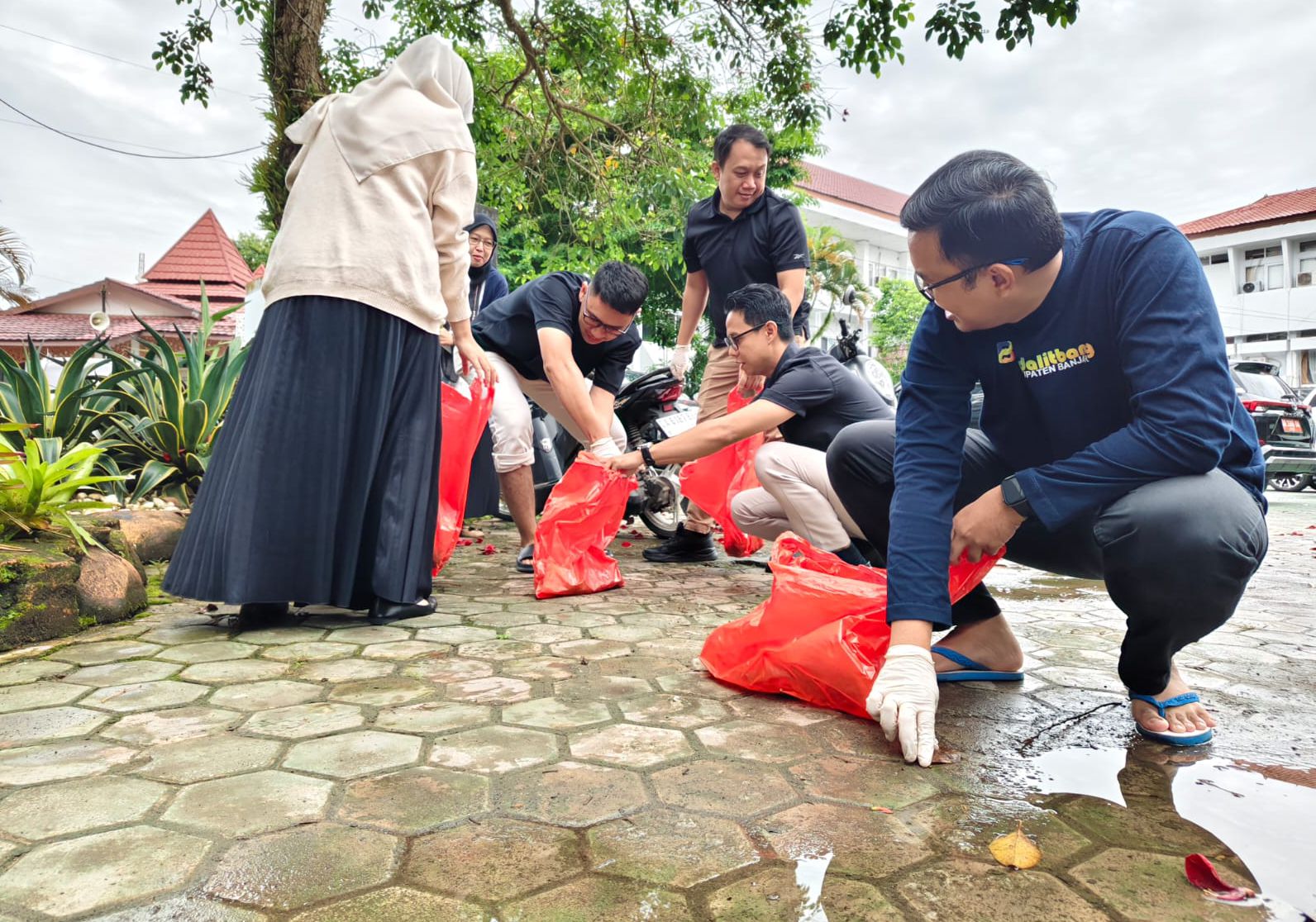 Sejak pagi, Kepala Bappedalitbang Kabupaten Banjar Nashrullah Shadiq bersama jajaran pimpinan struktural tampak berbaur dengan staf, membersihkan halaman kantor, memungut sampah, serta merapikan area sekitar. Suasana gotong royong terasa hangat, mencerminkan kebersamaan antarpegawai tanpa sekat jabatan dalam menjaga lingkungan kerja tetap tertata.